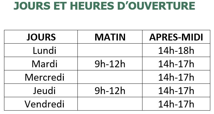 - Mardi et jeudi : 9h – 12h et 14h – 17h